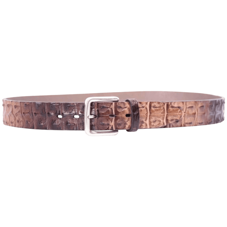 Fausto Colato fertigt im Herzen Mailands Gürtel, die Material und Handwerk sprechen lassen. Das Modell 5734 nutzt die Rückenmitte des Krokodils – jene Partien, deren Hornplatten dem Leder Präsenz und Robustheit verleihen. In Camouflage Braun ist der Ton bewusst zurückgenommen: kombinierbar, hochwertig, alltagstauglich. Die 4 cm Breite passt zu gepflegter Denim, Chinos und strukturierten Wollhosen; der Gürtel hält die Form und entwickelt mit der Zeit eine feine Patina.