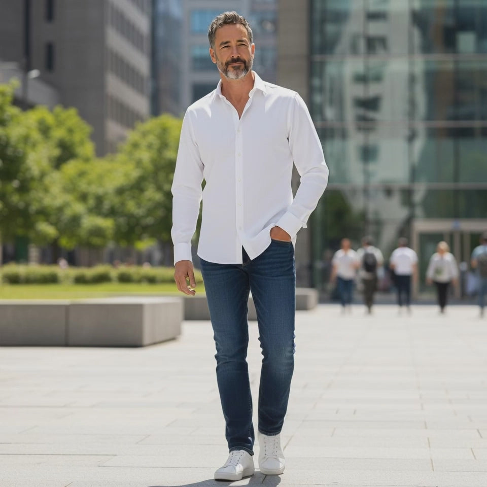 Weiß ist die universelle Farbe für einen aufgeräumten, souveränen Auftritt. Funktioniert solo, unter Blazer oder mit leichter Strickjacke – zu Navy, Grau, Beige oder Denim. Ein Hemd für Menschen, die Substanz der Show vorziehen; das Understatement kommt von selbst.