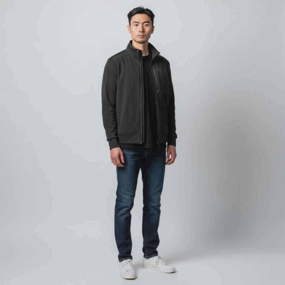 Packbar gedacht: Douglas verschwindet schnell im Weekender, ist aber sofort einsatzbereit als smarte Zwischenlage unter einer leichten Jacke oder solo über dem Hemd. Moderne, urbane Linien machen das Stück zum verlässlichen Begleiter vom Gate bis zur Bar.