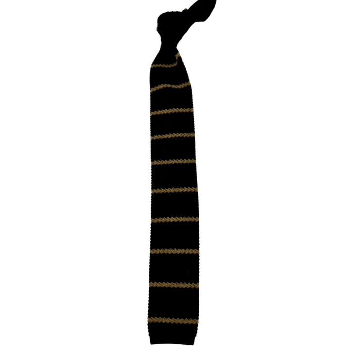 クラシックなネイビーに細いベージュのストライプが入ったウール100%のニット・タイは、時代を超越したスタイルとモダンな落ち着きを兼ね備えている。裾のストレート仕上げが特徴的だ。ニット・タイは現在、特にクラシックでスタイリッシュな装いに再び注目している若い世代の間で流行している。