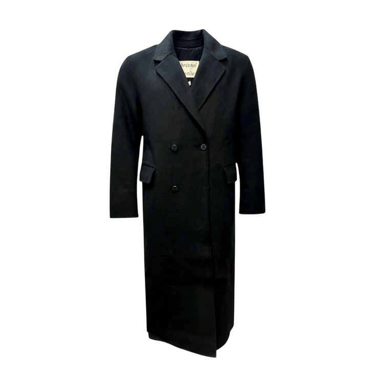 Brixtol Textiles „Hugo“ Mantel aus recycelter Wolle in Schwarz – langer Oversize-Schnitt, doppelte Knopfleiste & klare Silhouette